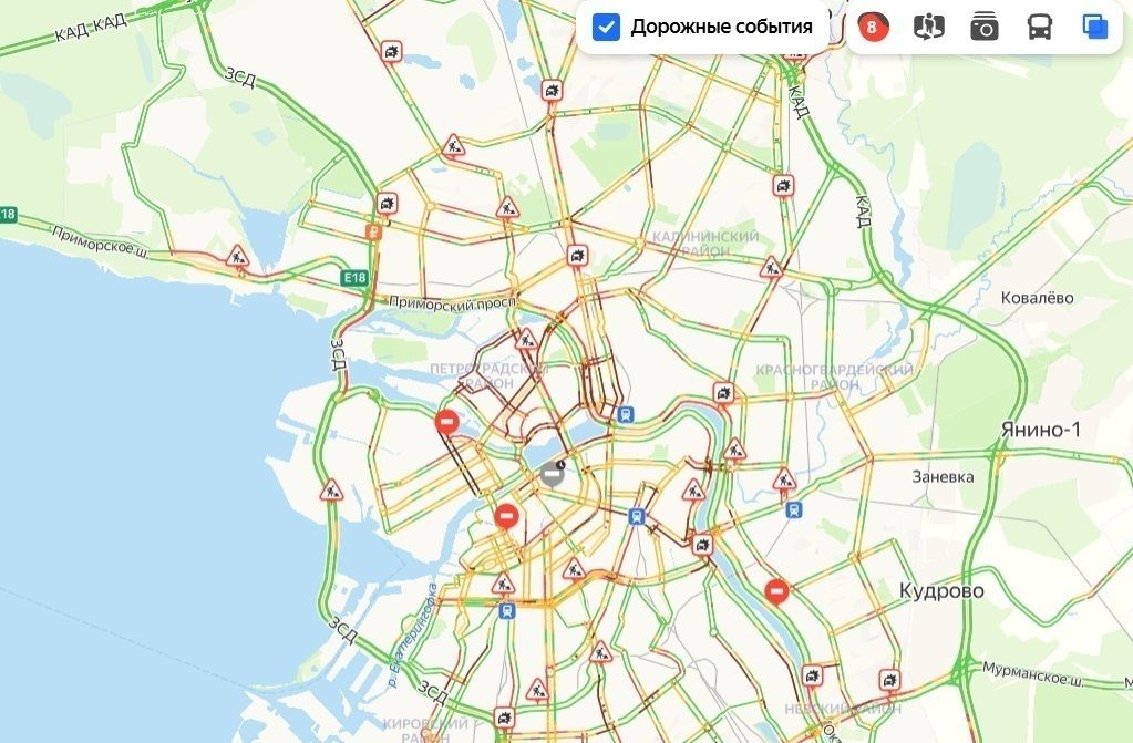 По прогнозам «Яндекс.Пробок», к 20 часам заторов на дорогах Северной столицы уже не будет.