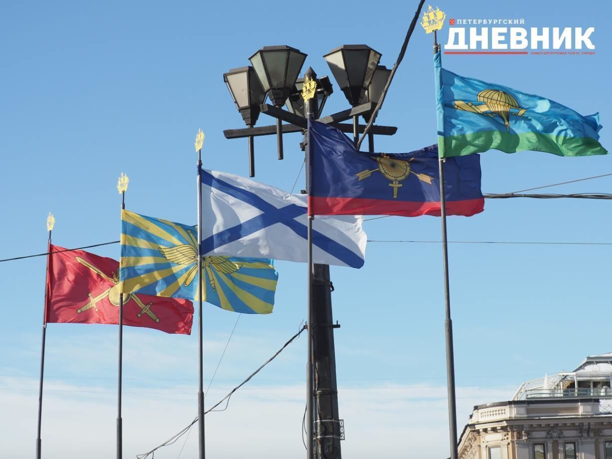 Также флаги России, Петербурга и ВМФ развеваются на Дворцовой площади, Невском и Лиговском проспектах, площади Труда.