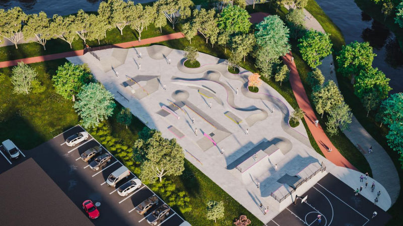 В парке будут построены не только трамплины для скейтбордистов, но и баскетбольная площадка. Помимо этого, рабочие проложат дорожки для прогулок.