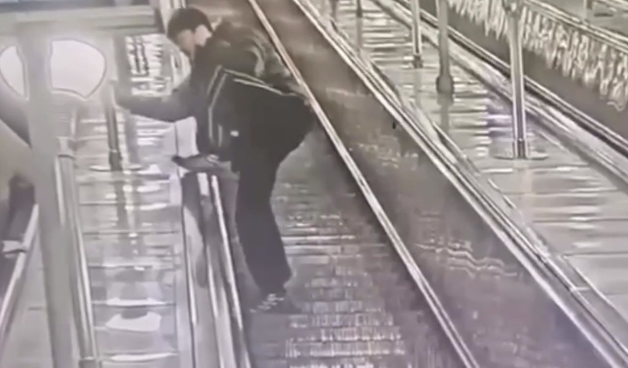 Молодые люди сначала безуспешно пытались подняться по сломанному эскалатору. Но потом, вместо того, чтобы спуститься, перебрались через перила эскалатора. Они перепрыгнули ограждение и переместились в толпу пассажиров другого подъемника.