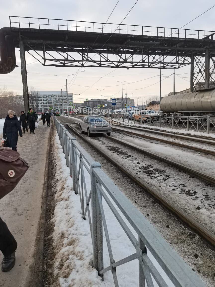 В Петербурге произошел транспортный коллпас на улице Корабельной. Вечером в понедельник водитель легковушки блокировал движение рельсового транспорта, потому что решил проехать по рельсам. В результате лихач застрял на путях. А трамваи встали.