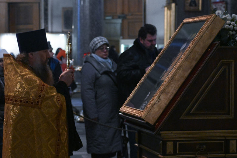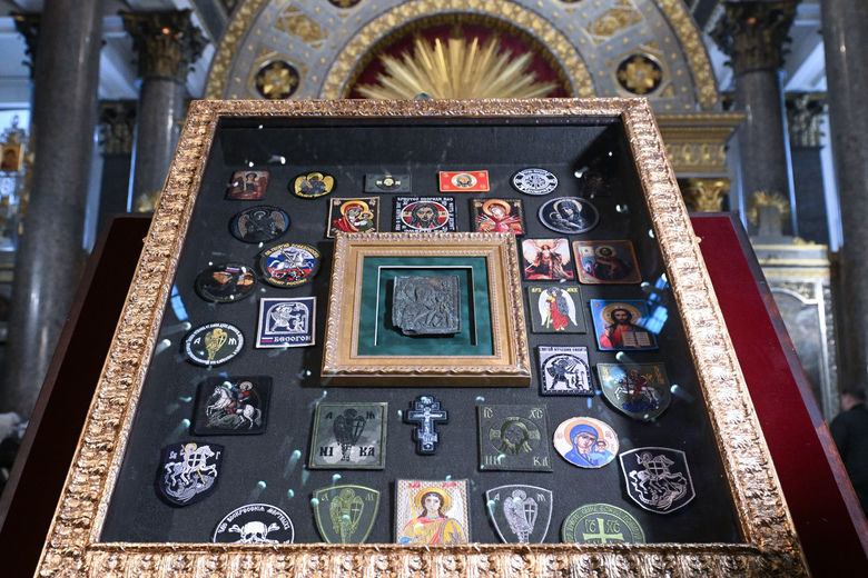 Богослужение совершено перед Смоленской иконой Божией Матери, обнаруженной поисковиками на местах боев под Сталинградом и переданной собору ветеранами специальной военной операции.