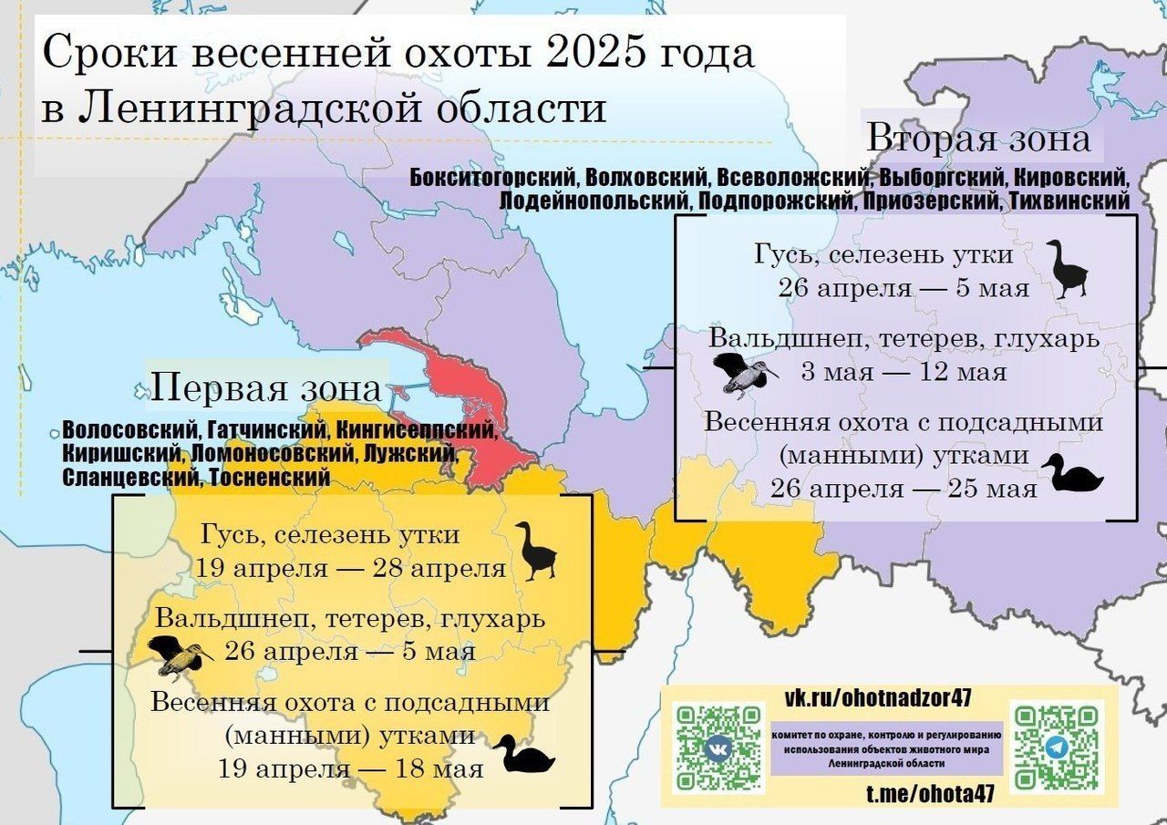 Сегодня, 25 февраля, Комитет по животному миру Ленинградской области обнародовал сроки весенней охоты в 2025 году. Регион поделен на две зоны, в которых установлены разные сроки охоты.