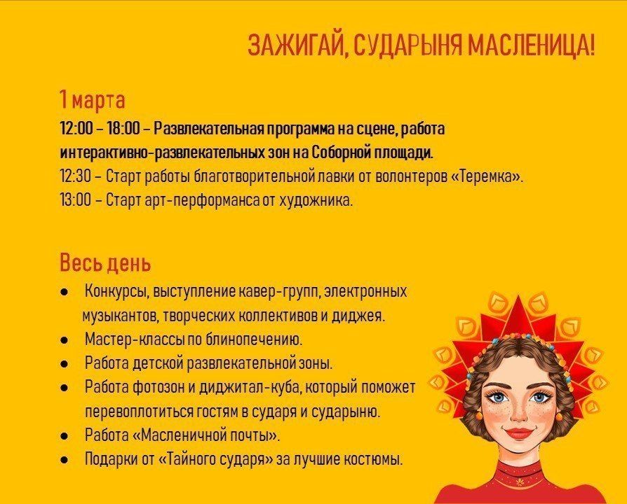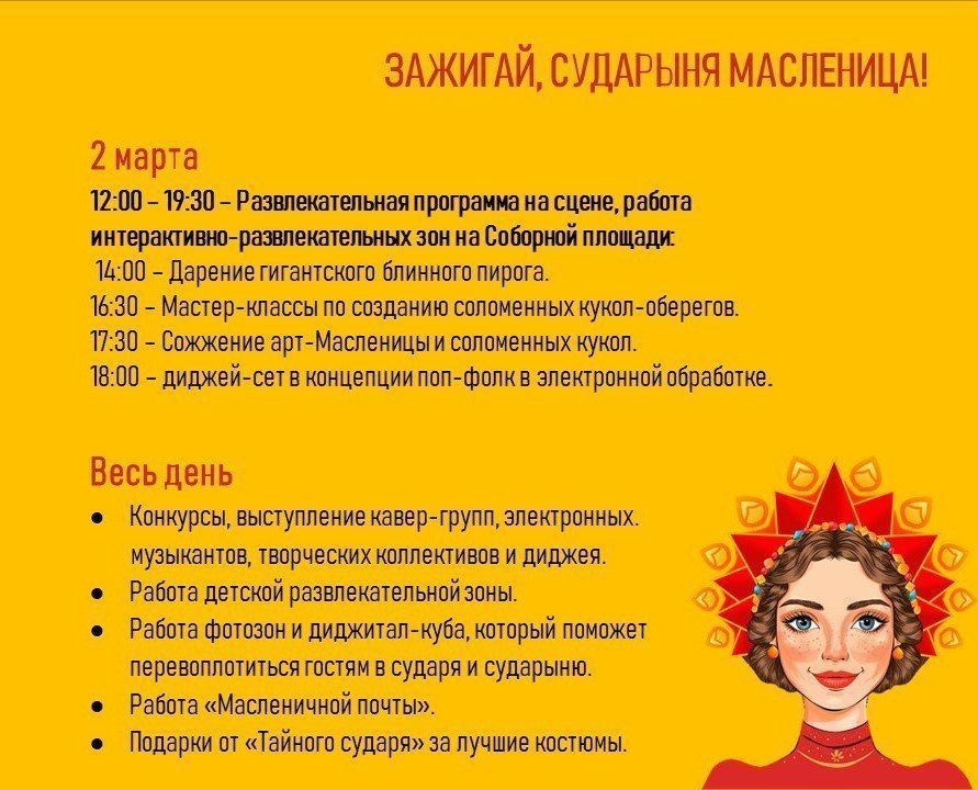 Отметим, 1 марта «Зажигай, Сударыня Масленица» будет идти с 12:00 до 18:00, а 2 марта – с 12:00 до 19:30.