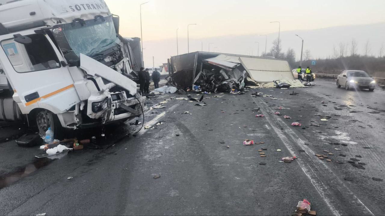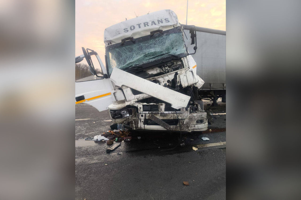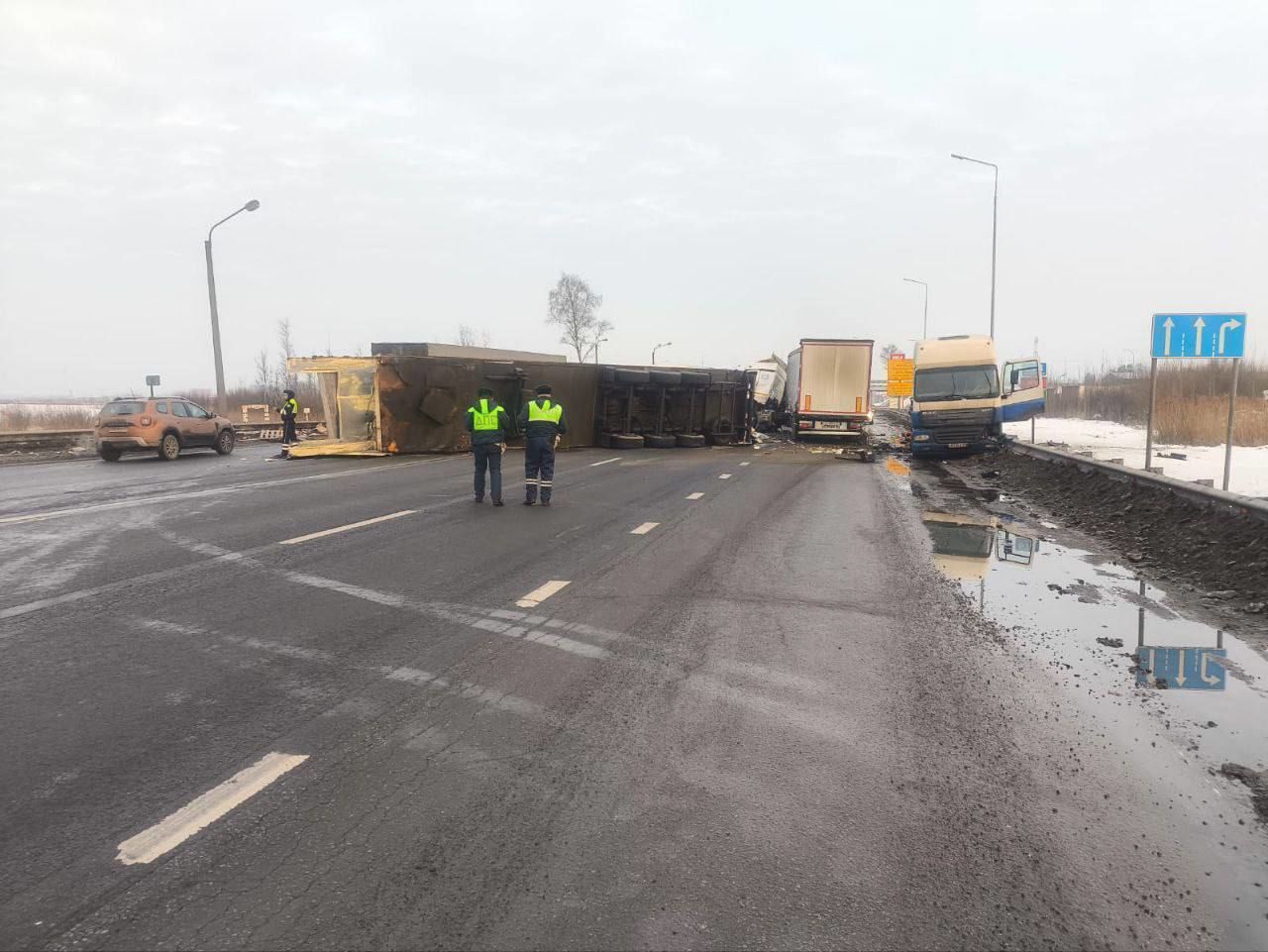 По имеющимся данным, столкновение двух фур и одной легковушки произошло в 17:25, один из грузовиков опрокинулся на проезжей части.