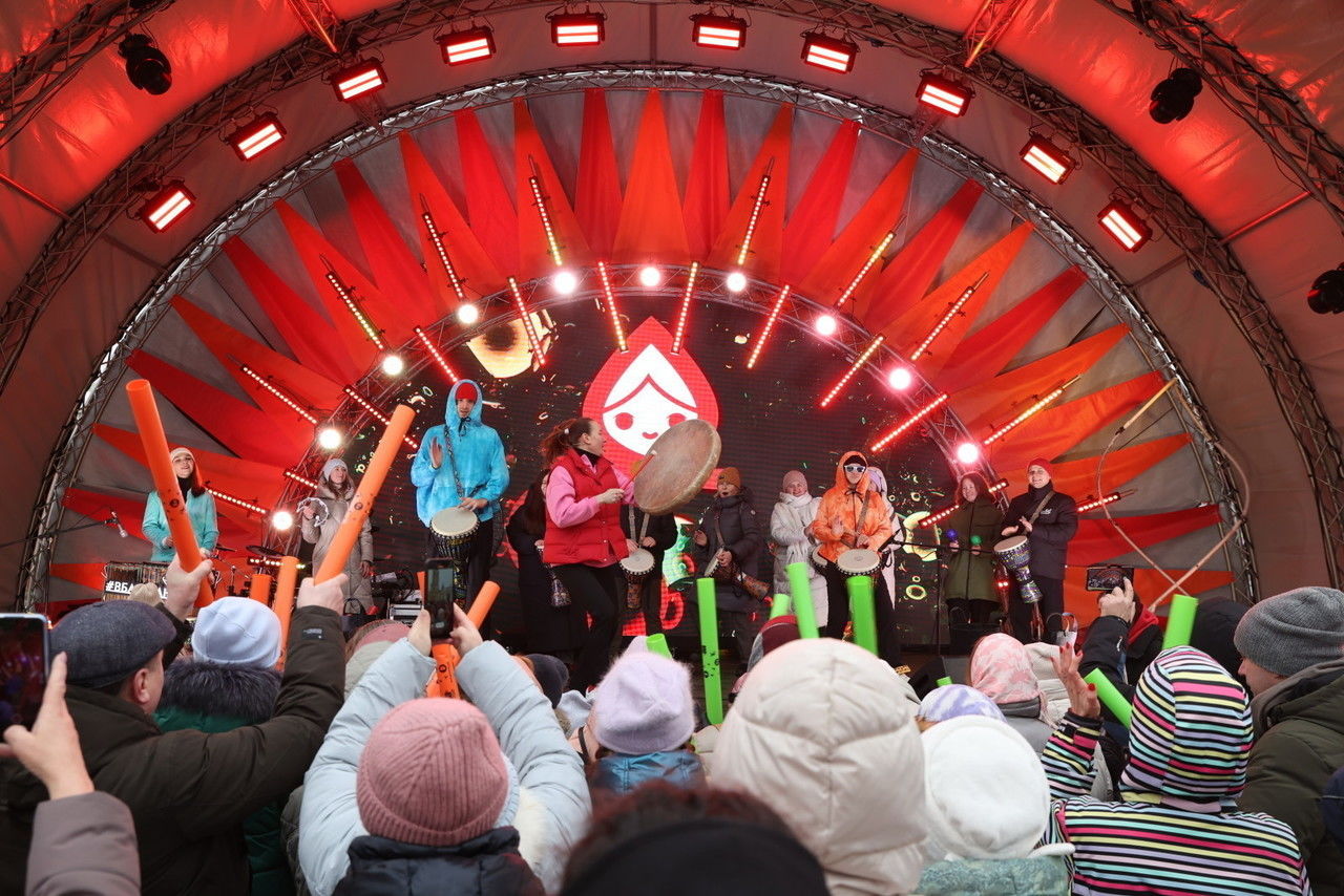 На сцене-солнце в обширной развлекательной программе приняли участие различные творческие коллективы, а также диджей Виталий Маслов, который смешал поп-фолк с электронной музыкой. Под новые вариации всем знакомых песен «Калинка», «Валенки», «Улетай на крыльях ветра» активно танцевали гости разных возрастов.
