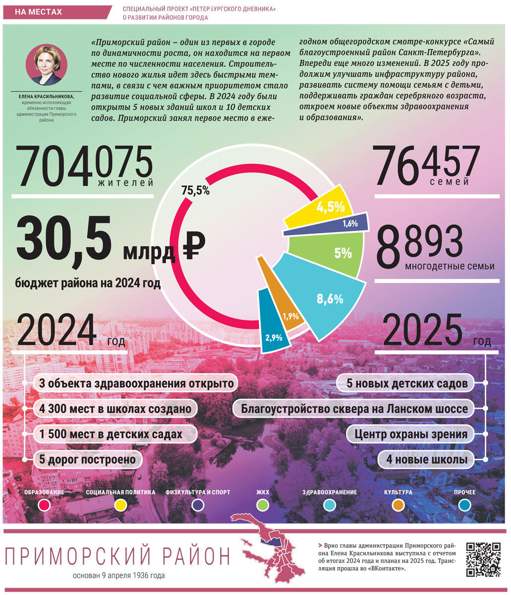 «Приморский район – один из самых динамично растущих в городе, находится на первом месте по численности населения. Строительство нового жилья идет быстрыми темпами, в связи с чем важным приоритетом является развитие социальной сферы в районе. В 2024 году были открыты пять новых зданий школ и 10 детских садов, а также три объекта здравоохранения. Наш район занял первое место в ежегодном общегородском смотре-конкурсе «Самый благоустроенный район Санкт-Петербурга». Впереди еще много изменений. В 2025 году продолжим работу по улучшению инфраструктуры района, развитию системы помощи семьям с детьми, поддержке граждан серебряного возраста, откроем новые объекты здравоохранения и образования», – рассказала она.