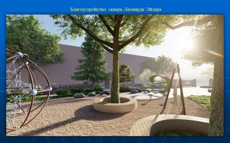 Александр Беглов поручил главе Василеостровского района провести работы по благоустройству сквера. Планируется проложить пешеходные дорожки, организовать зоны отдыха, установить уличную мебель, освещение, отремонтировать ограждение и добавить зелёные насаждения. Также планируется оборудовать сквер современными игровыми и спортивными комплексами, музыкальными инструментами и установить навес с качелями «Квадрат Эйлера». Работы должны быть завершены до конца 2025 года.