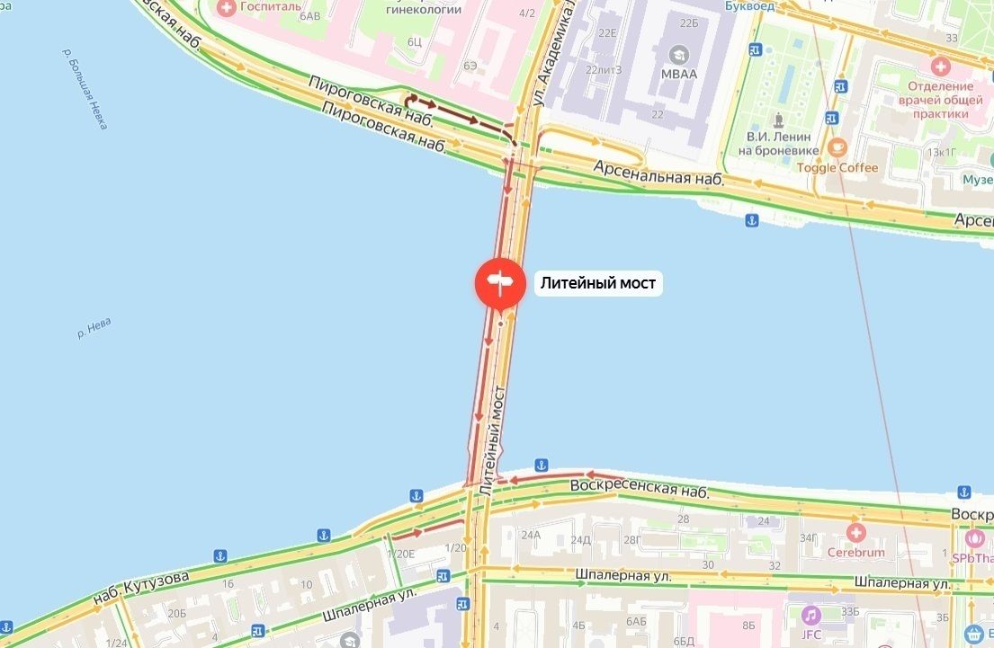Вечером в среду в Петербурге перекрыли Литейный мост. По данным «Яндекс Карт», движение по переправе не осуществляется. Водители пишут в соцсетях, что перекрытие организовано сотрудниками ДПС, сообщает Piter.TV.