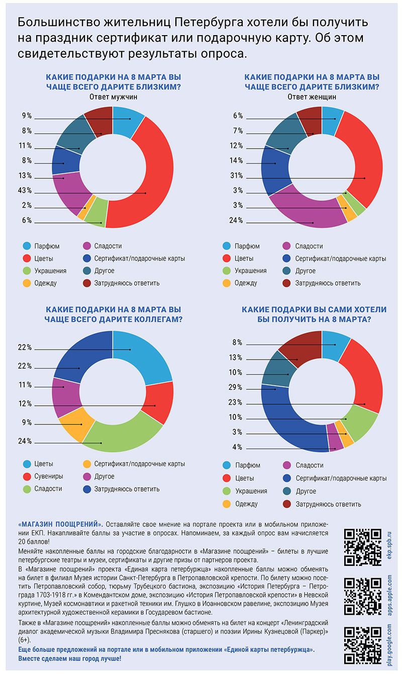 Большинство жительниц Санкт-Петербурга хотели бы получить на праздник сертификат или подарочную карту. Об этом свидетельствуют результаты опроса, который провел «Петербургский дневник» совместно с «Единой картой петербуржца».