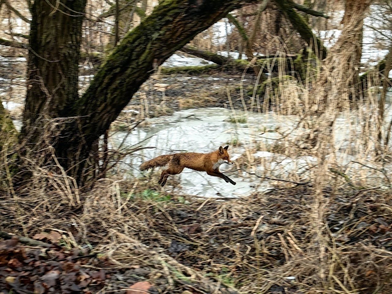 Рыжая красавица с интересом наблюдала за работой специалистов с безопасного расстояния. Когда садовники попытались подойти поближе, лиса грациозно подпрыгнула и скрылась в массиве парка.