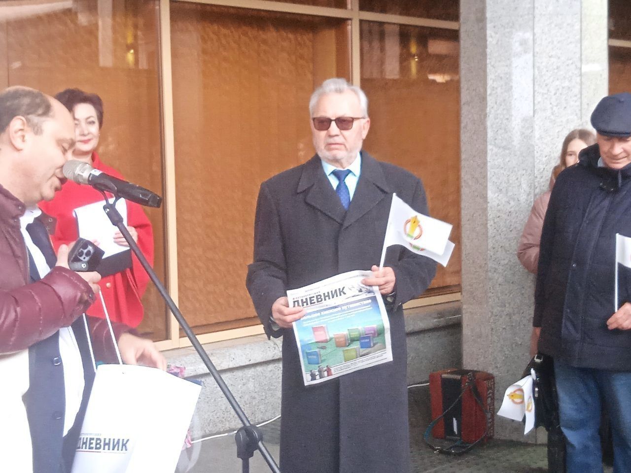 Пассажиров поезда в Минске встретил председатель Союза писателей Беларуси Александр Карлюкевич.