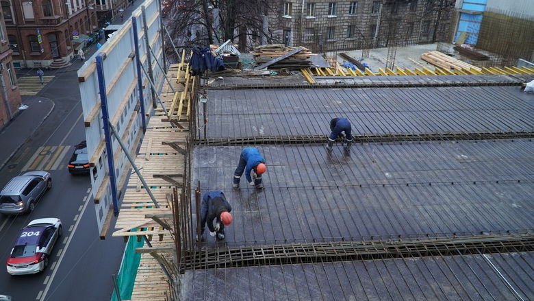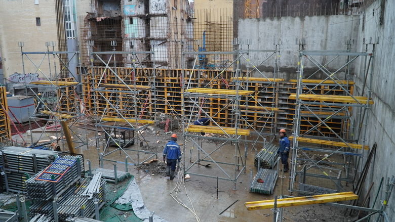 Как рассказали в компании, которая является главным подрядчиком на объекте, сейчас выполняется усиление основания здания, в том числе устройство свайного поля. На уровне 6-7-го этажей завершаются монолитные работы, в том числе с дымоходами и системами вентиляции.