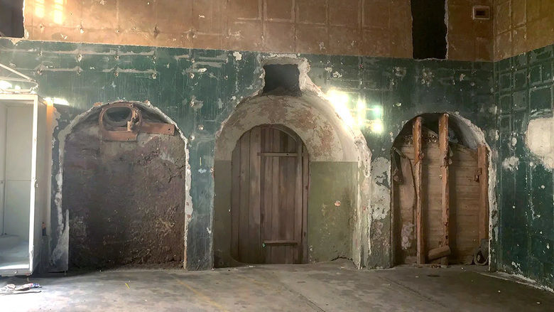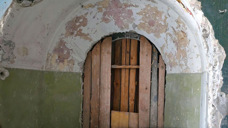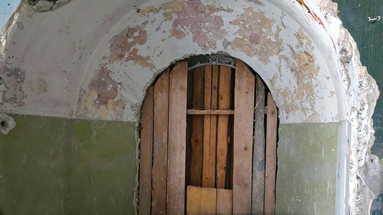 Специалисты нашли роспись во время разбора обшивок стен в зале на пятом этаже, где ранее находилась одна из студий Пятого канала. За картонными акустическими панелями оказались заполненные строительным мусором три глубокие полукруглые ниши – экседры с фрагментами живописи, закрашенной масляной краской. После расчистки реставраторы взяли образцы росписи для исследования химического состава и провели работы по ее укреплению и консервации, заклеив специальной особо прочной бумагой.