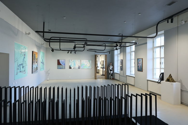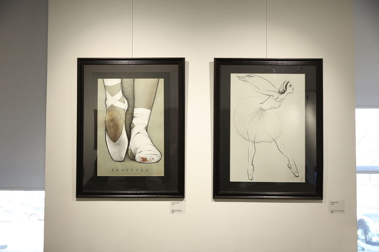 Внимание сразу же привлекают работы художника Олега Котельникова. Его серия «Анна Павлова», созданная специально для галереи, поражает смелыми образами: балерина, крутящая фуэте на спине слона, соседствует с сюрреалистичными черепами.