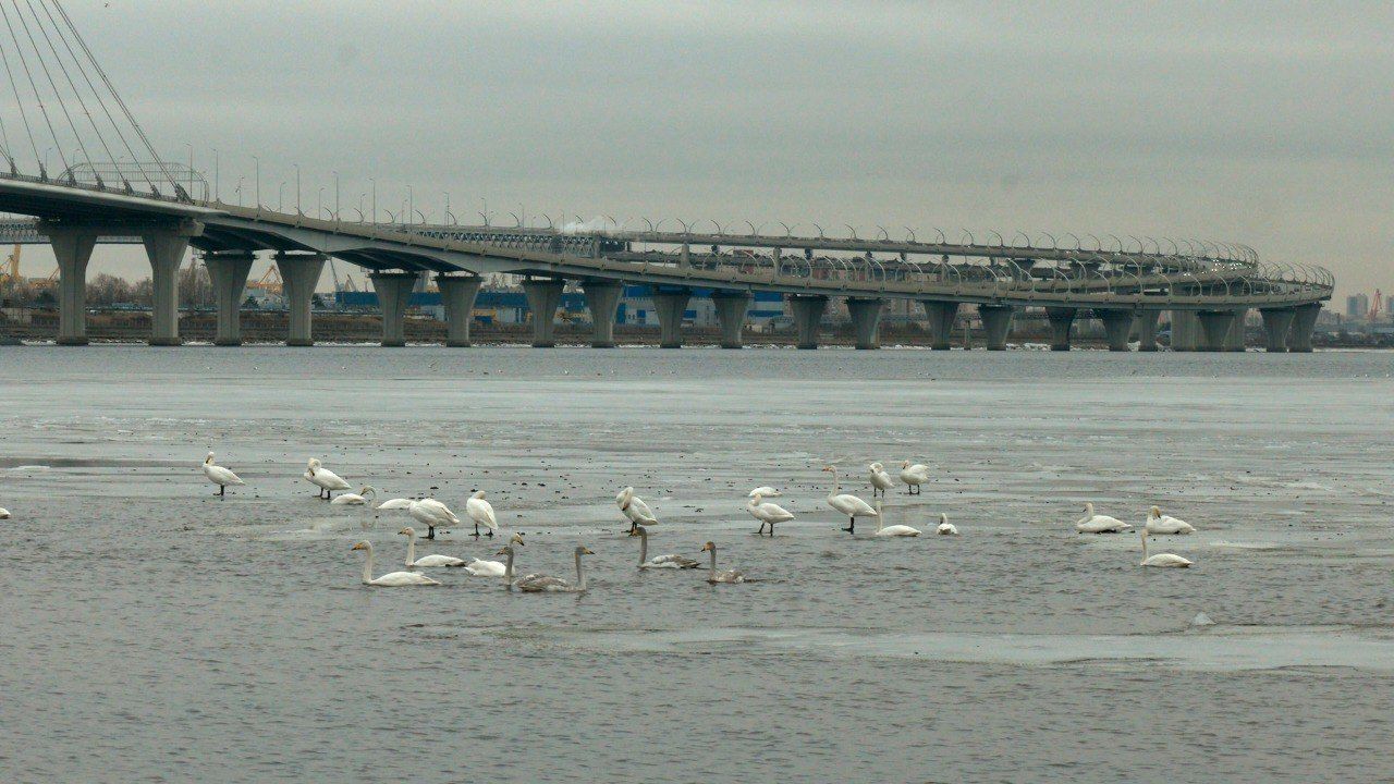 Прямо в черте города в устье Невы находится около 50 этих птиц, которые прибыли рано в этом году.