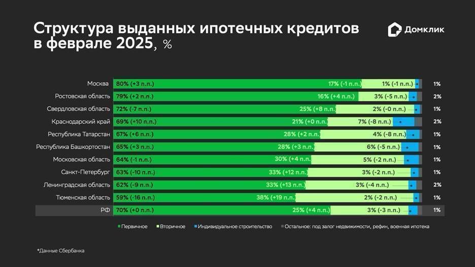 Лидерами по доле сделок со вторичным жильем стали регионы с относительно низким объемом строительства: Чеченская Республика, Томская и Амурская области. В феврале доля вторичного рынка в общем объеме выдач составила 78,3%, 56,0% и 45,1% соответственно.