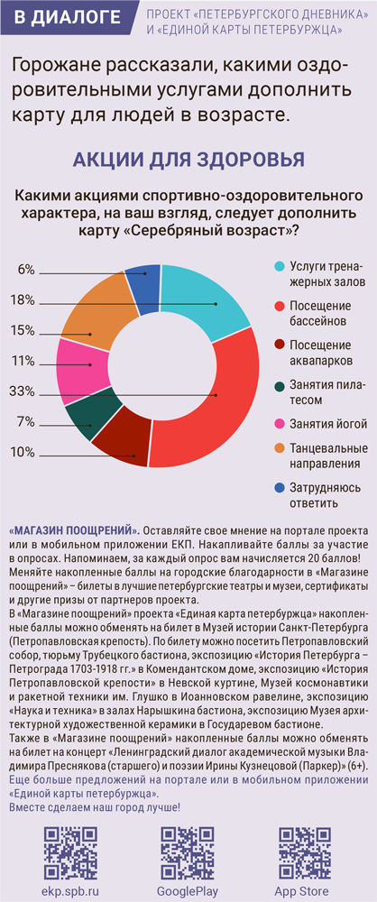 Опрос, проведенный изданием «Петербургский дневник» совместно с порталом «Единая карта петербуржца» (ЕКП), показал, какими акциями спортивно-оздоровительного характера следует дополнить карту «Серебряный возраст».