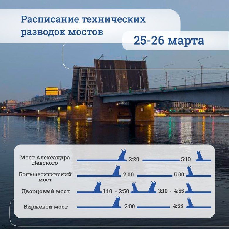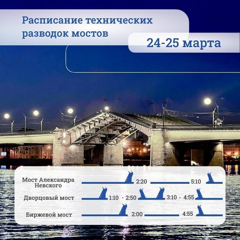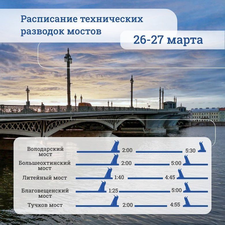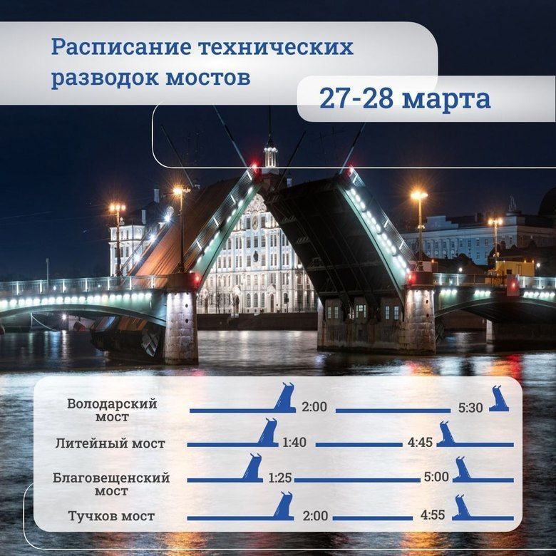 Стал известен график технических разводок мостов с 24 по 30 марта, сообщили сегодня в пресс-службе «Мостотреста». При наличии изменений информация будет опубликована в соцсетях предприятия, а также на сайте и в приложении «Мосты Петербурга».
