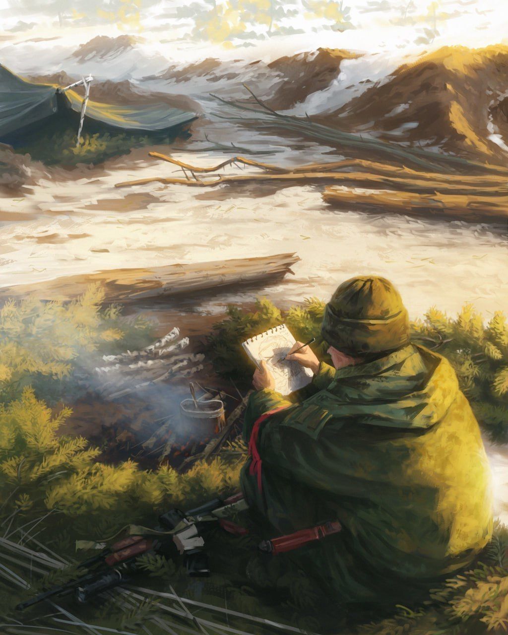 Словно фотографии с фронта, эти работы поражают своей атмосферой и удивительной точностью. Складывается впечатление, что создавший их художник сам воевал. Но на фронте Данил не был – в 16 лет он получил спинномозговую травму и с тех пор передвигается на инвалидной коляске. Однако солдатскую жизнь знает – от отца, который ушёл в ополчение в первые дни Русской весны и принимает участие в боевых действиях до сих пор.