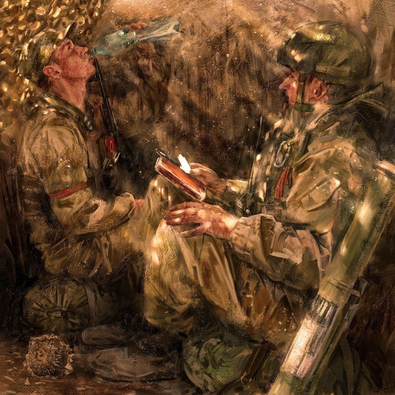 – У меня были мобилизованы одноклассник и несколько знакомых ребят из академии. Я за них, конечно, переживал. А мой отец тогда, в первые дни СВО, сделал фотографию: идут два мобилизованных, мы видим их только со спины, а за спиной у них – советские вещмешки и винтовки Мосина... Остальное я уже додумал, достроил в своей голове по рассказам отца. На самом деле я раньше часто брал за основу фотографии с фронта: да, там не идеальная композиция, цвета, но я по-другому расставлял людей, предметы. А вот сюжет недавней картины «Жажда» я придумал. Но просил позировать отца и брата.