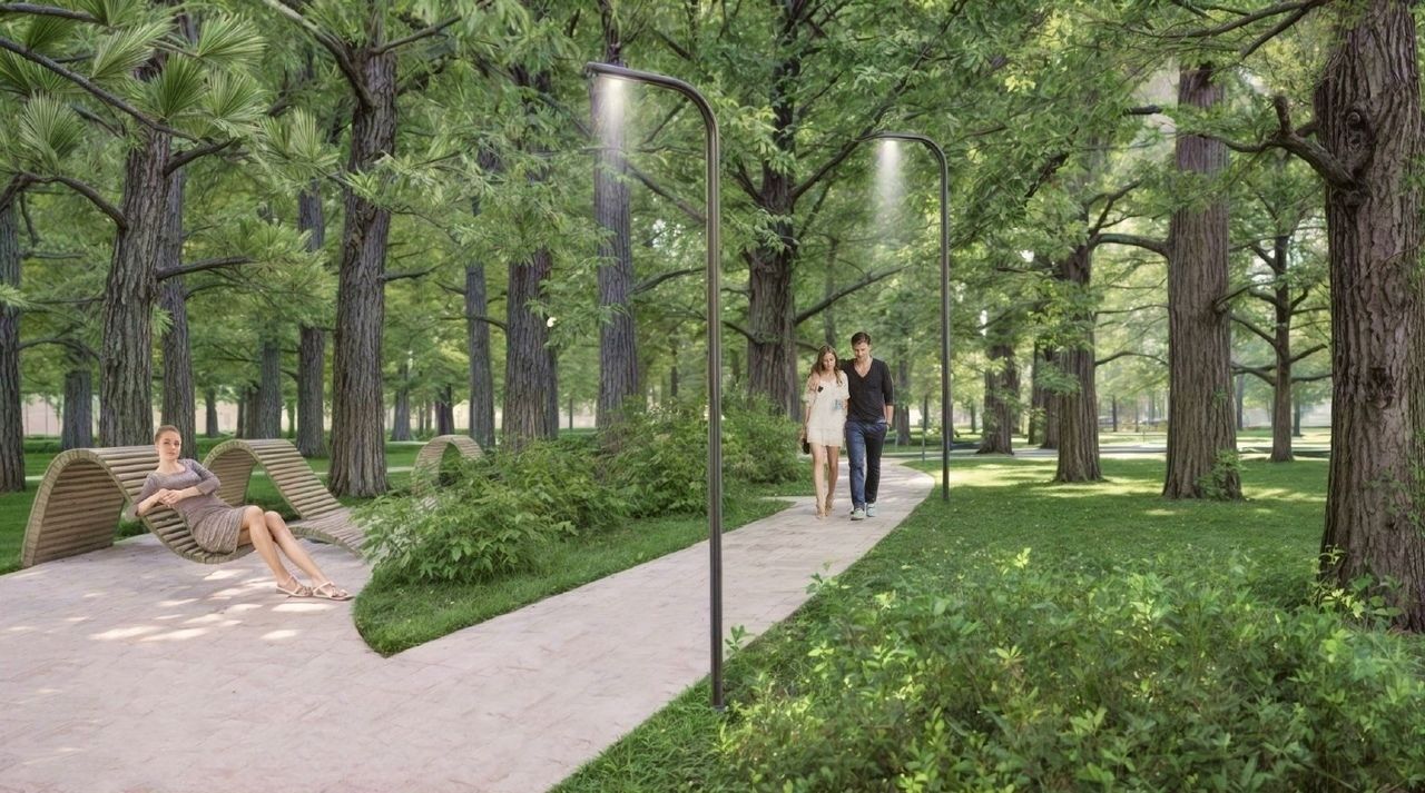 Для взрослых предусмотрено несколько зон отдыха – с шезлонгами, со столами и изящные перголы. Также на территории будет спортивная площадка с оборудованием и элементами геопластики. Запланирована посадка барбариса Тунберга и спиреи серой.