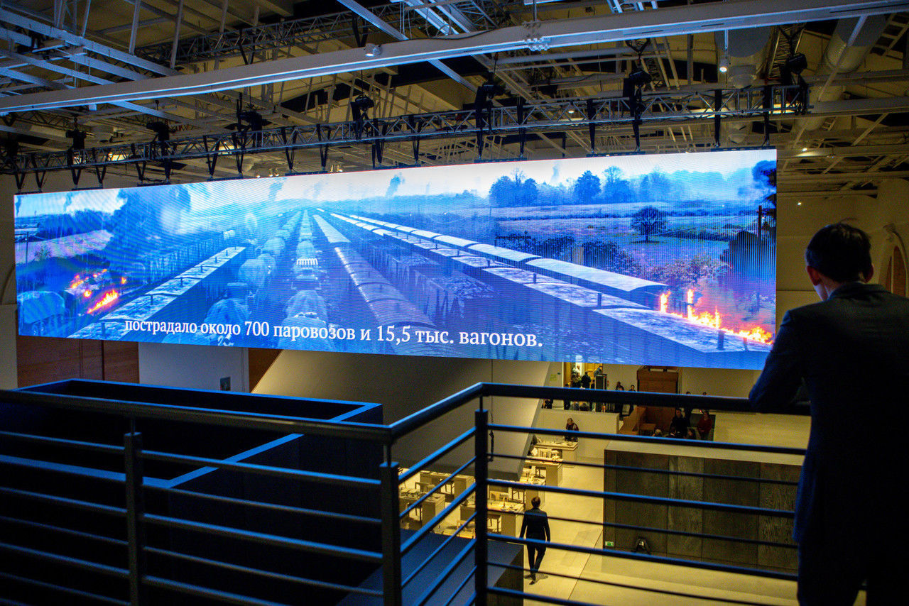 Центральное место на первом этаже отведено промышленности. Здесь – и потом этот прием будет повторен – сначала обозначается проблема, затем рассказывается о том, как она решается. «Ключ к решению – информация на экранах. Например, нажав на кнопку интерактивной карты полезных ископаемых, можно узнать, где и какие месторождения были открыты и освоены в годы войны. А в разделе «Транспорт» увидеть макеты вагонов для вывоза предприятий и населения. И даже копию гроба, в котором перевозили из мавзолея в Тюмень тело Ленина.