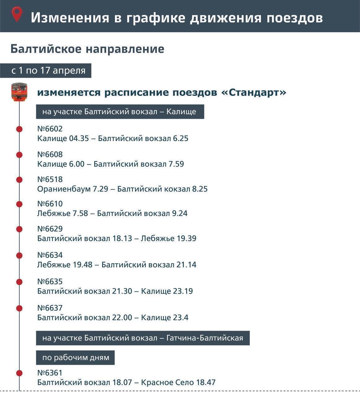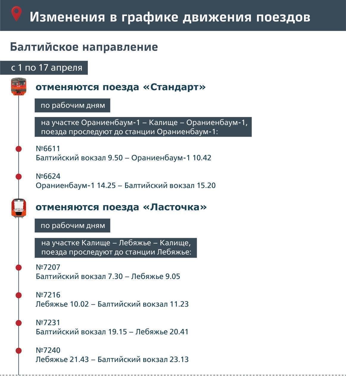 В связи с плановым ремонтом железнодорожной инфраструктуры с 1 по 17 апреля изменится движение пригородных поездов на Балтийском направлении Октябрьской железной дороги.