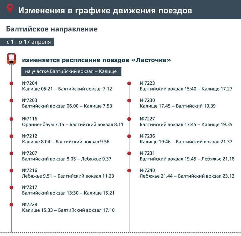 – №7216 отправление из Лебяжья в 10:02, прибытие на Балтийский вокзал в 11:23;