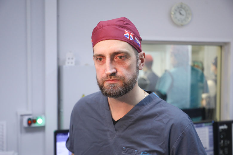 Завотделением рентгенхирургии НИИ Джанелидзе Максим Киселев прокомментировал операцию в соседней операционной. Там проходило эндопротезирование аорты.