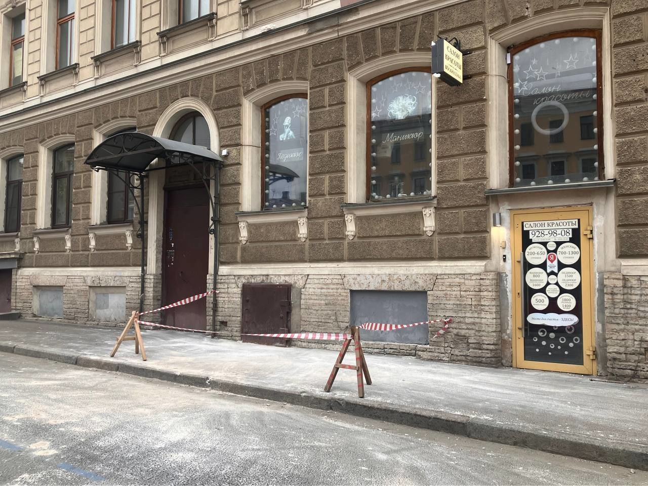 Большой кусок карниза откололся и рухнул на Набережной канала Грибоедова, 81. Тротуар огородили. В здании находятся салон красоты, барбершоп.