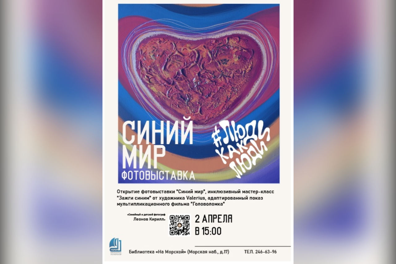 2 апреля, во Всемирный день распространения информации о проблеме аутизма, в библиотеке «На Морской» откроется выставка вдохновляющих фотографий, состоится инклюзивный мастер-класс и показ адаптированной версии мультфильма «Головоломка» (6+). Вход свободный для посетителей любого возраста и ментального здоровья.