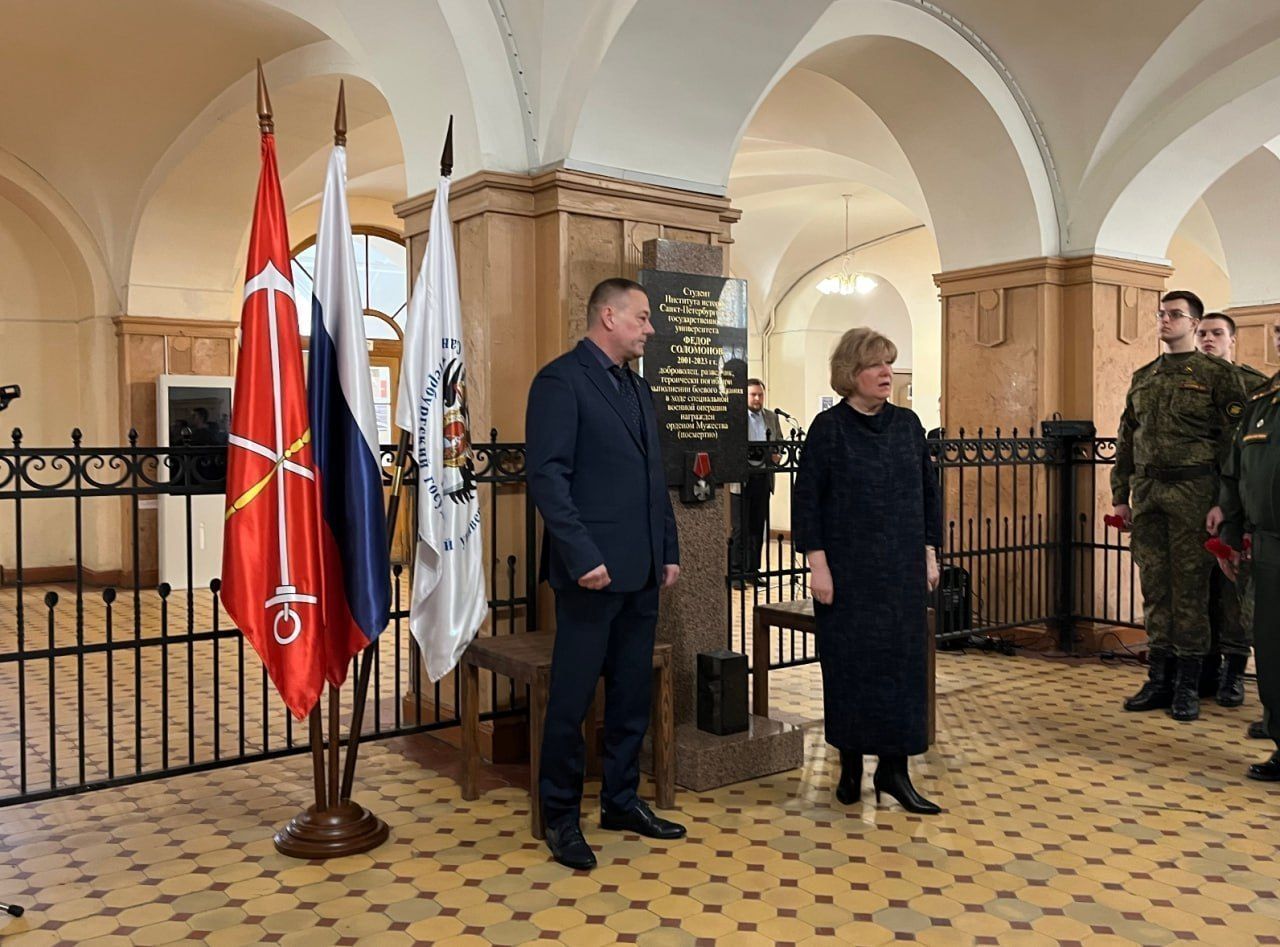 В мероприятии приняла участие мать погибшего солдата Галина Сергеевна. Женщина открыла стелу и почтила память сына. После с речью выступила ученый секретарь СПбГУ, заместитель председателя Ученого совета СПбГУ Елена Чернова. От имени всего университета она выразила благодарность матери героя и вручила Галине Соломоновой медаль, которой наградил ректор СПбГУ Федора посмертно.
