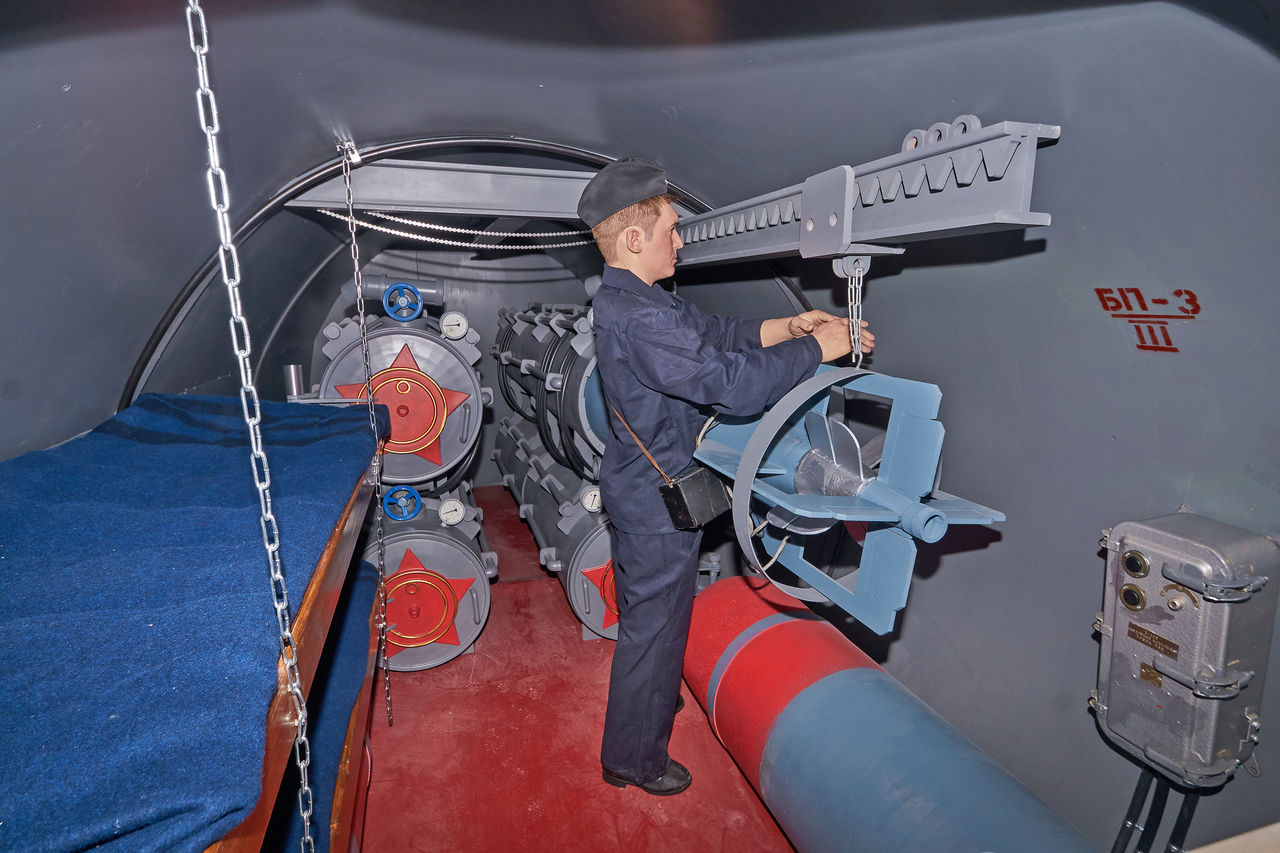 На входе в музей, стилизованном под герметичную переборочную дверь, вас встречает портрет Александра Маринеско. Поворачиваем налево и попадаем в носовой торпедный отсек. В торце – трубы торпедных аппаратов и восковая фигура матроса. Тут же откидные койки, чтобы дать представление о том, как непросто жилось в походе членам экипажа. В музее очень много интерактивных экспонатов, помогающих узнать всё об истории С-13, судьбе её командира и всего советского подводного флота.