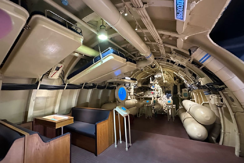 Лодка открыта для посещения. Она значительно больше, на ненамного комфортнее «Народовольца». И вообще, комфорт, даже для самых современных подводных лодок, – понятие относительное. Все они в первую очередь носители оружия и технических средств. И этим всё сказано. Так что простор в отсеке подлодки – это только в кино, на кадрах, снятых широкоугольным объективом.