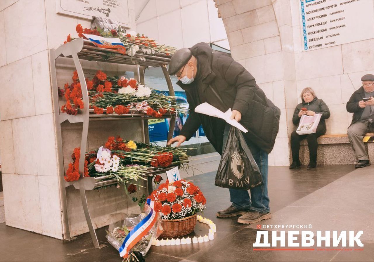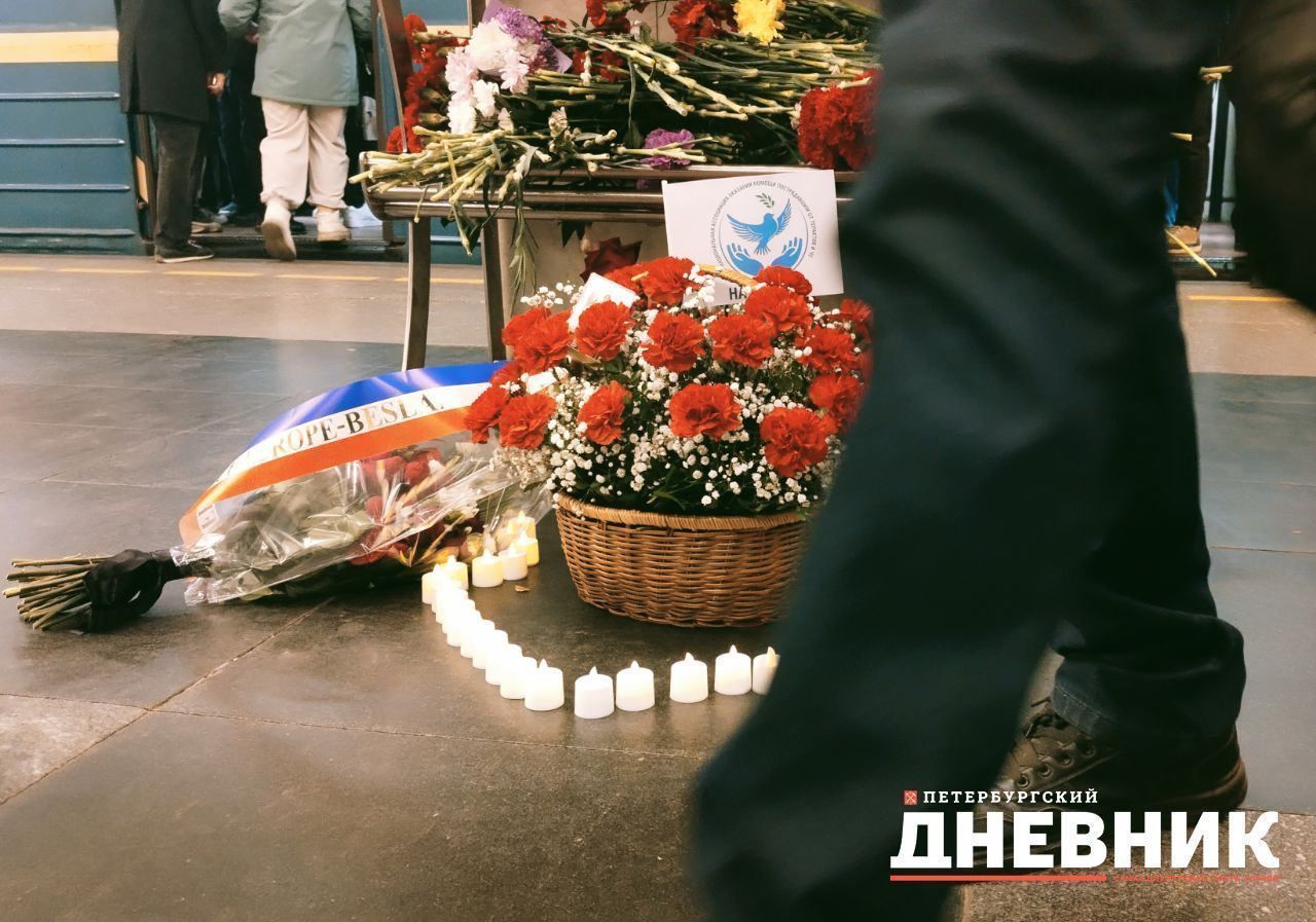 Как уже рассказывал «Петербургский дневник», многие горожане уже с самого утра приносили цветы и свечи к мемориалу, устроенному в подземном вестибюле станции «Технологический институт», а также к стенам самой станции на Московском проспекте.