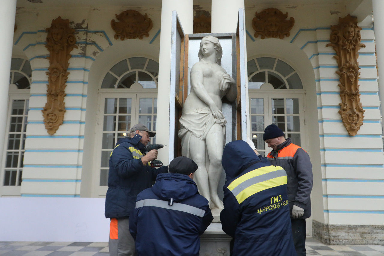 В Царском Селе через несколько дней начнут снимать зимние укрытия с парковой скульптуры