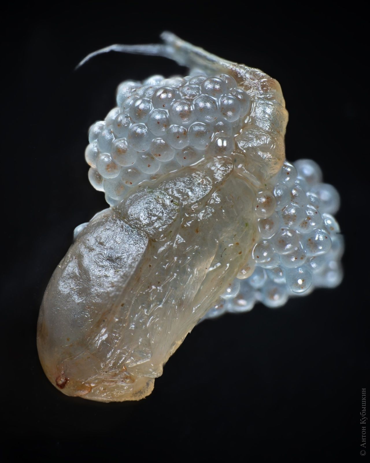 На снимке изображена самка циклопа с яйцами. Как отмечают в сообществе «Грибы и Грибники СПб», самки циклопов носят яйца с собой после откладывания, а не оставляют их в укромном месте.