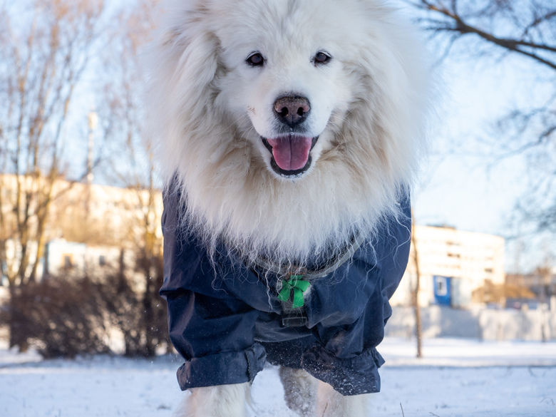 Олег Золото также запечатлел собаку в комбинезоне, которая вышла на утреннюю прогулку.