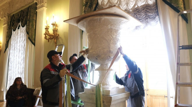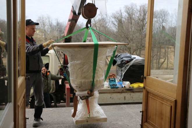 Для перемещения массивной конструкции использовалась специальная техника. На пьедестал вновь установили ранее отреставрированную вазу из белого мрамора весом более 120 кг.