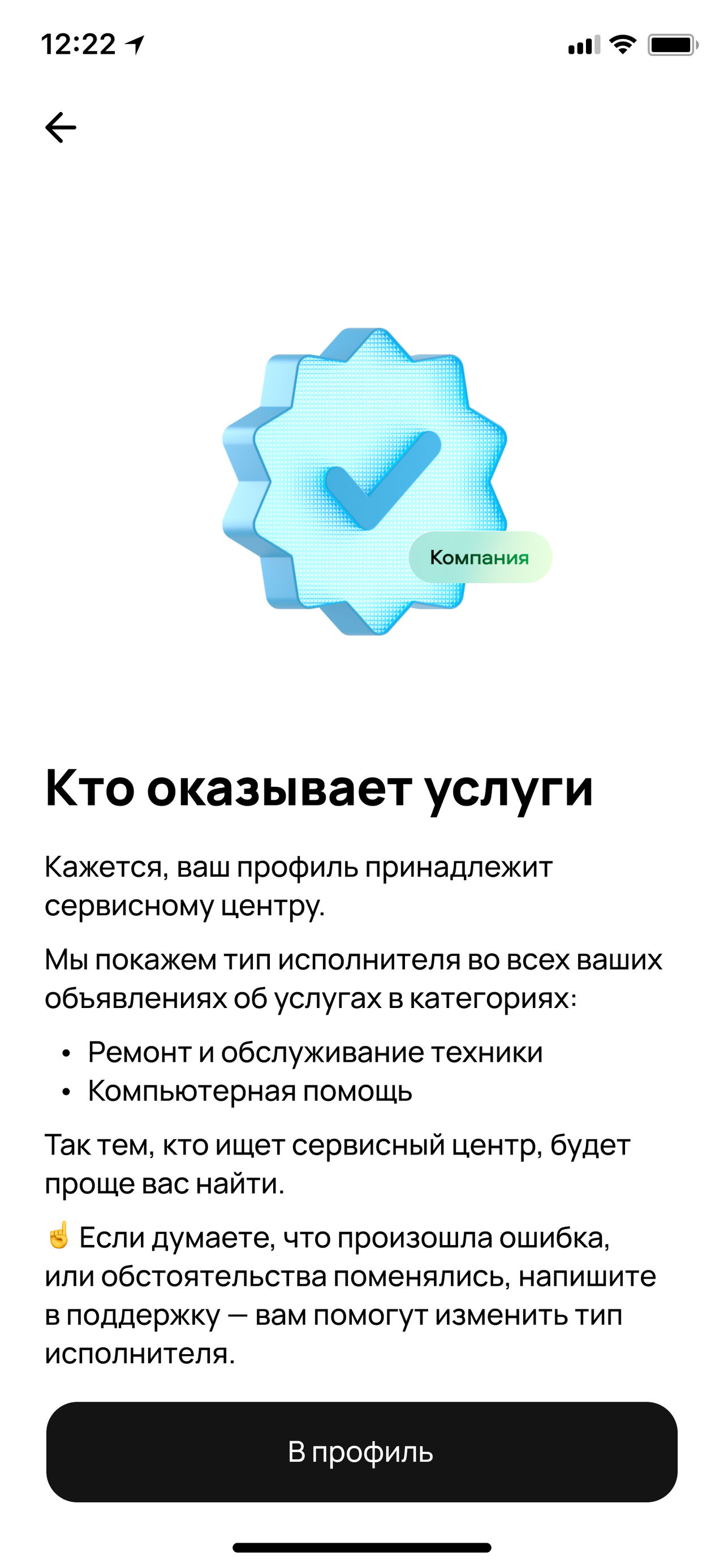 Основное нововведение заключается во введении нового типа исполнителя – «Сервисный центр». Этот статус можно присвоить вручную через личный кабинет либо автоматически, используя ML-модель, которая анализирует профиль и объявления исполнителей на предмет соответствия критериям сервисного центра. Благодаря специальной отметке такие центры становятся более заметными для пользователей, выделяясь среди частных мастеров.