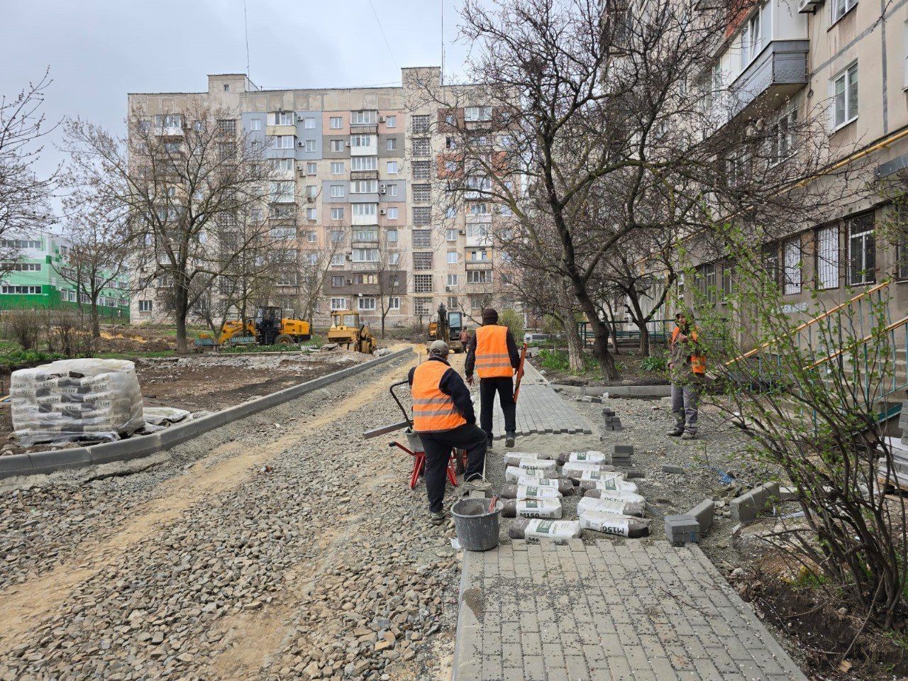Петербургские рабочие благоустраивают дворы в Мариуполе