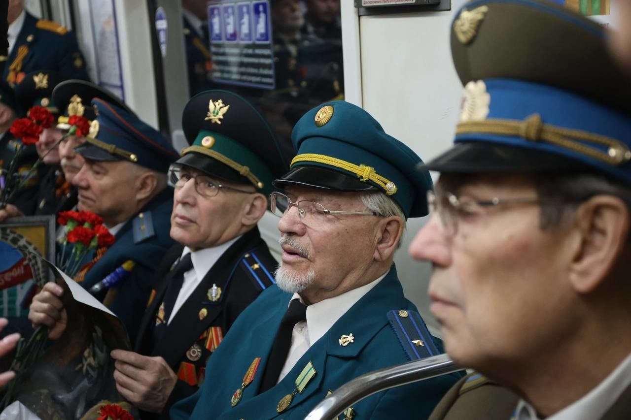 Первыми почётными пассажирами стали представители хора ветеранов Великой Отечественной войны и военной службы имени Козлова, которые устроили импровизированный концерт. На стенах вагонов размещены рисунки – около 30 работ учащихся художественных школ.