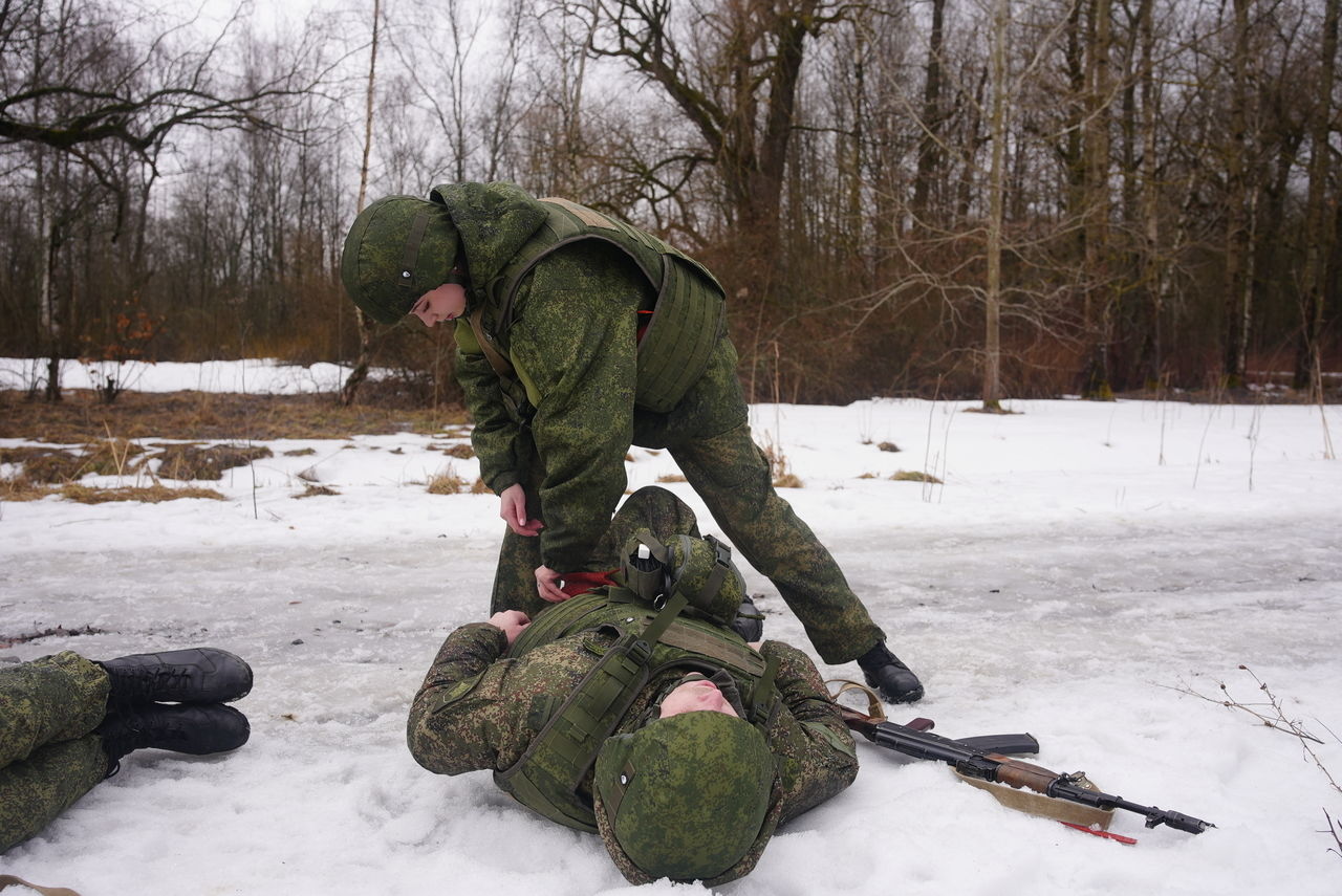 И на сегодняшних занятиях по тактической медицине кажется, что всё идёт своим чередом. Группа военнослужащих отрабатывает наложение жгута. Инструктор определяет зону ранения, после чего передвигается между условно раненными, указывает на ошибки, подсказывает, как сделать правильно.