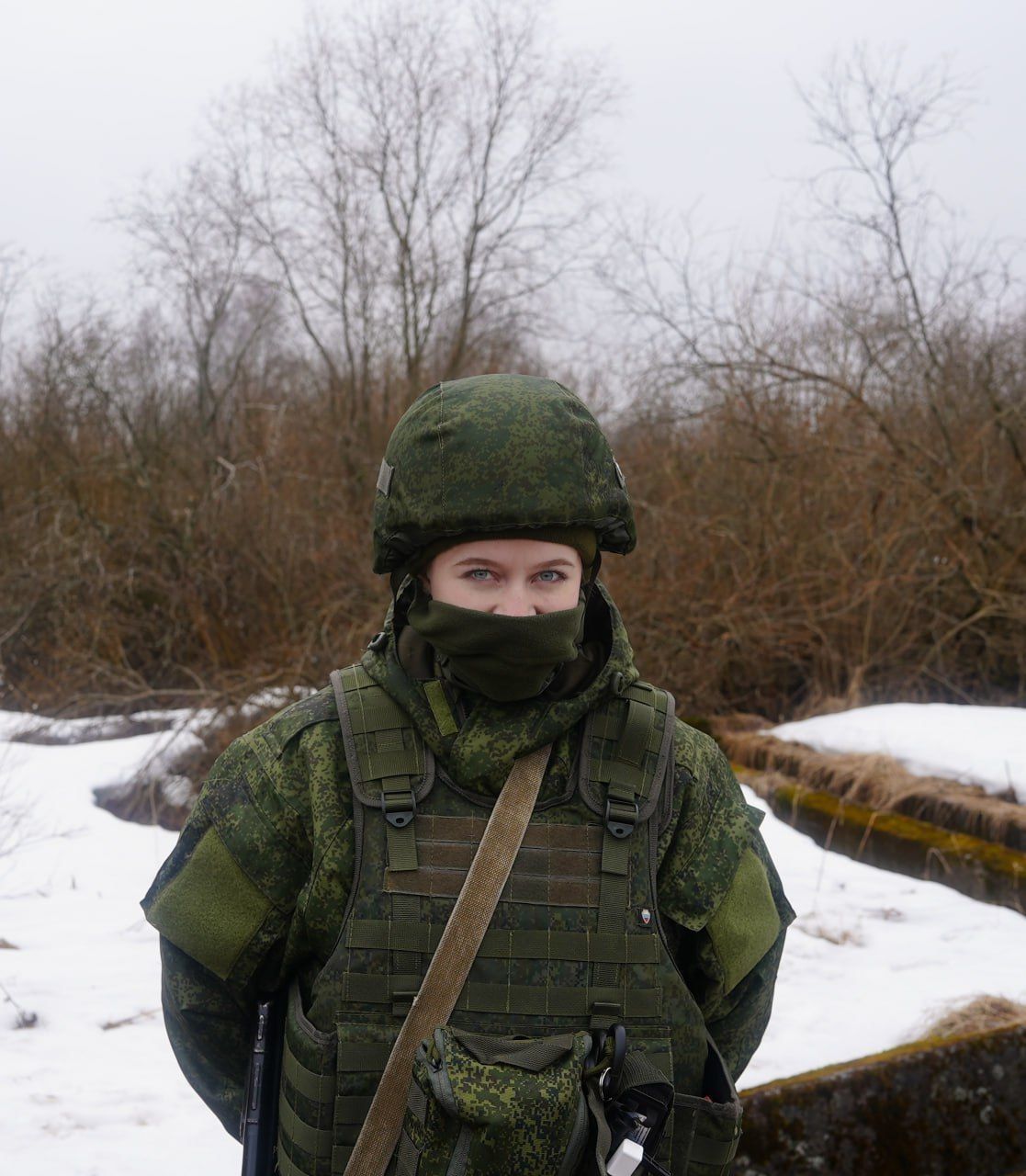 В фигуре, скрытой зимним бушлатом, угадывается стройный девичий стан. И из-под шлема выбивается непослушный локон волос. Вдобавок замечаю серёжки, красующиеся в ушах. Лицо спрятано под балаклавой, но голубые глаза, обрамлённые длинными ресницами, внимательно наблюдают за происходящим вокруг.