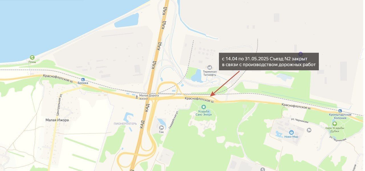 Из-за работ с 14 апреля по 31 мая года на путепроводе транспортной развязки «Бронка» закроется съезд № 2 (направление от Краснофлотского шоссе со стороны Ломоносова на КАД).