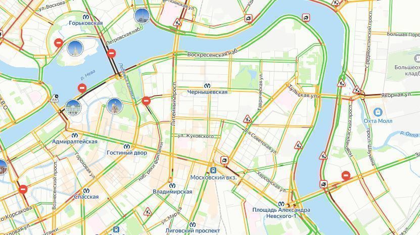Сейчас сложно проехать по набережной Обводного канала и Малоохтинской набережной. «Красные» участки есть у станций метро «Лесная» и «Петроградская».