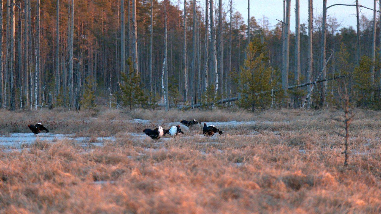 В Приозерском районе Ленинградской области начался брачный период у тетеревов. Ранним утром самцы собираются на токовищах, где исполняют свою весеннюю песню.