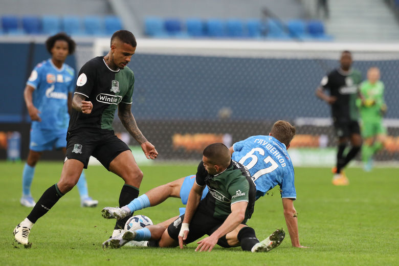 Открыв счёт, «быки», как зовут команду из города на берегах Кубани, уступили инициативу петербургской команде. Зенитовцы отыгрались на исходе получаса игры. Максим Глушенков, получив пас от Вендела, не стал искать адресата для передачи, а сильно пробил низом. Вратарь южан Станислав Агкацев дотянулся до мяча, но Андрей Мостовой первым успел на добивание.