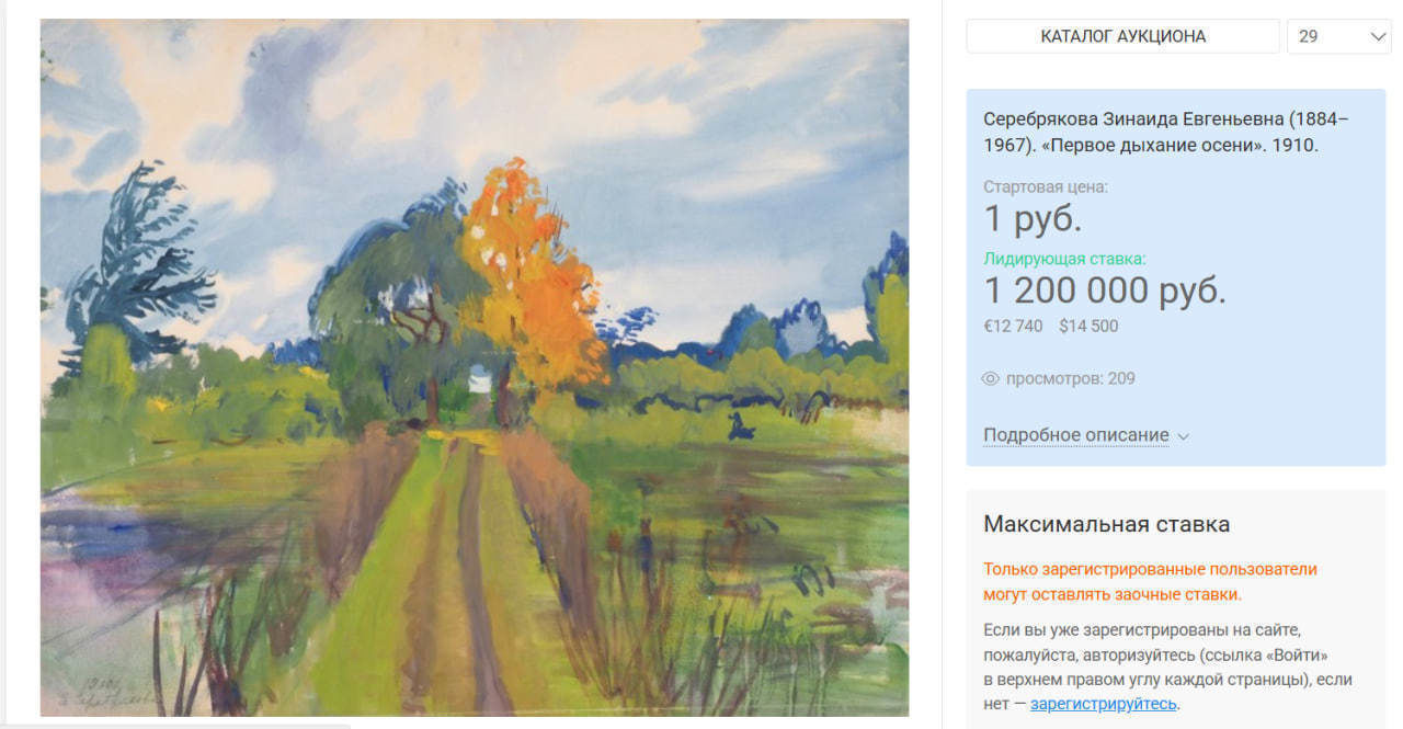 В Северной столице на аукцион выставлена картина «Первое дыхание осени» знаменитой русской художницы Зинаиды Серебряковой, которая сейчас оценена в 1,2 миллиона рублей. Этот этюд был создан в 1910 году.